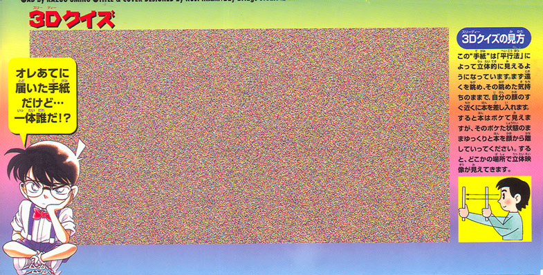 Number of times Ran does a karate move: 23 Number of times said move results in a panty shot: 2 (remarkable restraint from Aoyama-sensei!) Number of times Mouri hits Conan: 33 Number of times Conan "shoots" Mouri: 32 Number of times Mouri recieves a head injury that Conan uses to his advantage: 3 Not enough eye strain lately? Try this Conan "3D" magic-eye puzzle. |